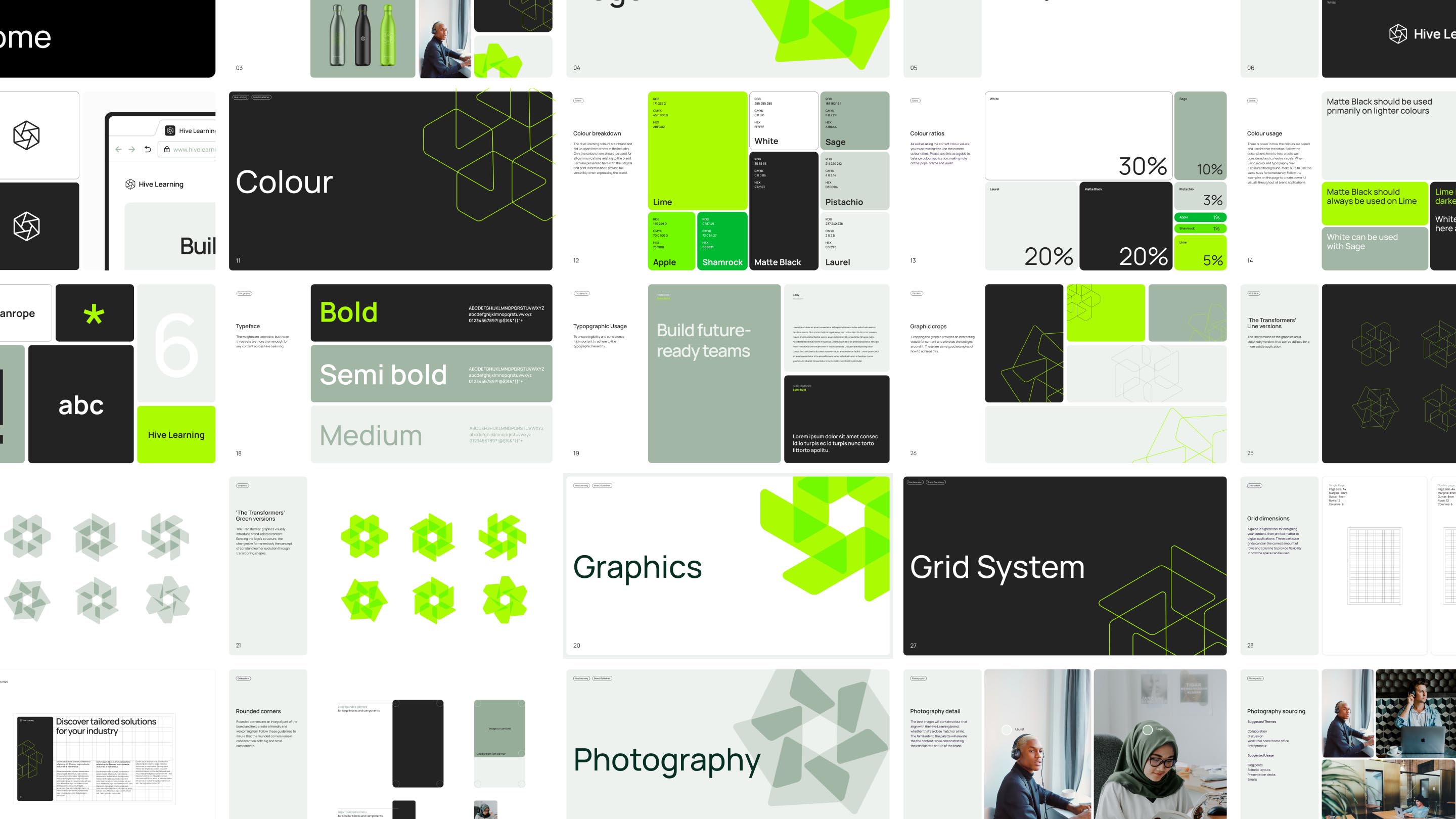 Hive Learning is a platform built to help organisations develop skills, capability and performance through collaborative learning. As the business matured, the brand needed to better reflect the clarity, intelligence and scale of the product itself. The existing visual identity had grown complex over time, with a broad colour palette and a logo mark that lacked a clear role within the wider system. The challenge was to strip things back and create a more coherent, flexible identity that could scale across product, marketing and brand touchpoints.